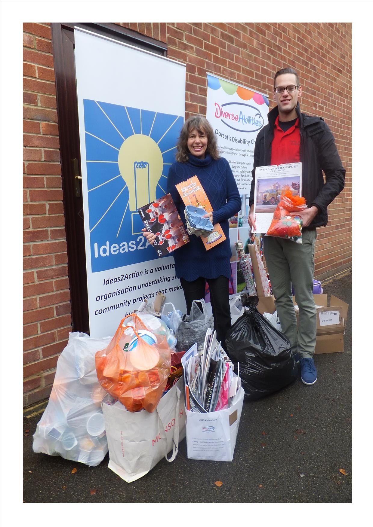 Hundreds of cardboard tubes, yoghurt pots, calendars, wrapping paper, cards, egg boxes, fruit nets and bottle tops were saved from waste and given to Jon Stroud, Awesome Nights & Play Opportunities Manager at local charity Diverse Abilities by Win on Waste groups in Canford Heath and Creekmoor after their January donation session on Saturday 16th. One kind Canford Heath resident donated all her craft equipment too. The items will be used by the children and young people the charity supports at their craft sessions.