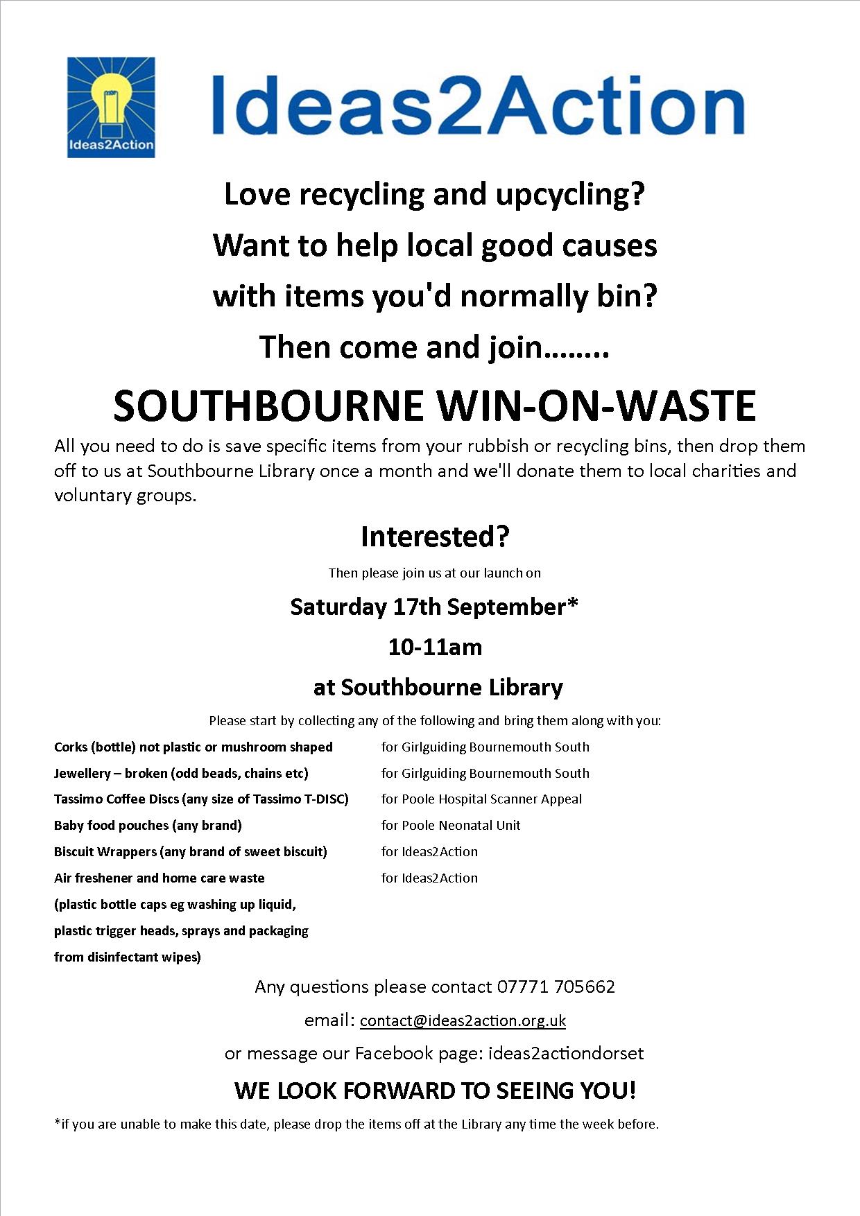 We’re thrilled to announce that Sarah Selby one of our wonderful Recycling Ambassadors is launching the first Win on Waste project in Bournemouth during Recycle Week.  The new Win on Waste sessions will be held in Southbourne and residents will have the opportunity to save items and take them to Southbourne Library.  It starts on Saturday 17 September between 10 and 11am and after that sessions will be held monthly at the library.  Items being collected for the first donation include: corks (bottle) not plastic or mushroom shaped, jewellery – broken (odd beads, chains etc.), Tassimo coffee discs (any size of Tassimo T-DISC), baby food pouches (any brand), biscuit wrappers (any brand of sweet biscuit), air freshener and home care waste (plastic bottle caps eg washing up liquid, plastic trigger heads, sprays and packaging from disinfectant wipes).