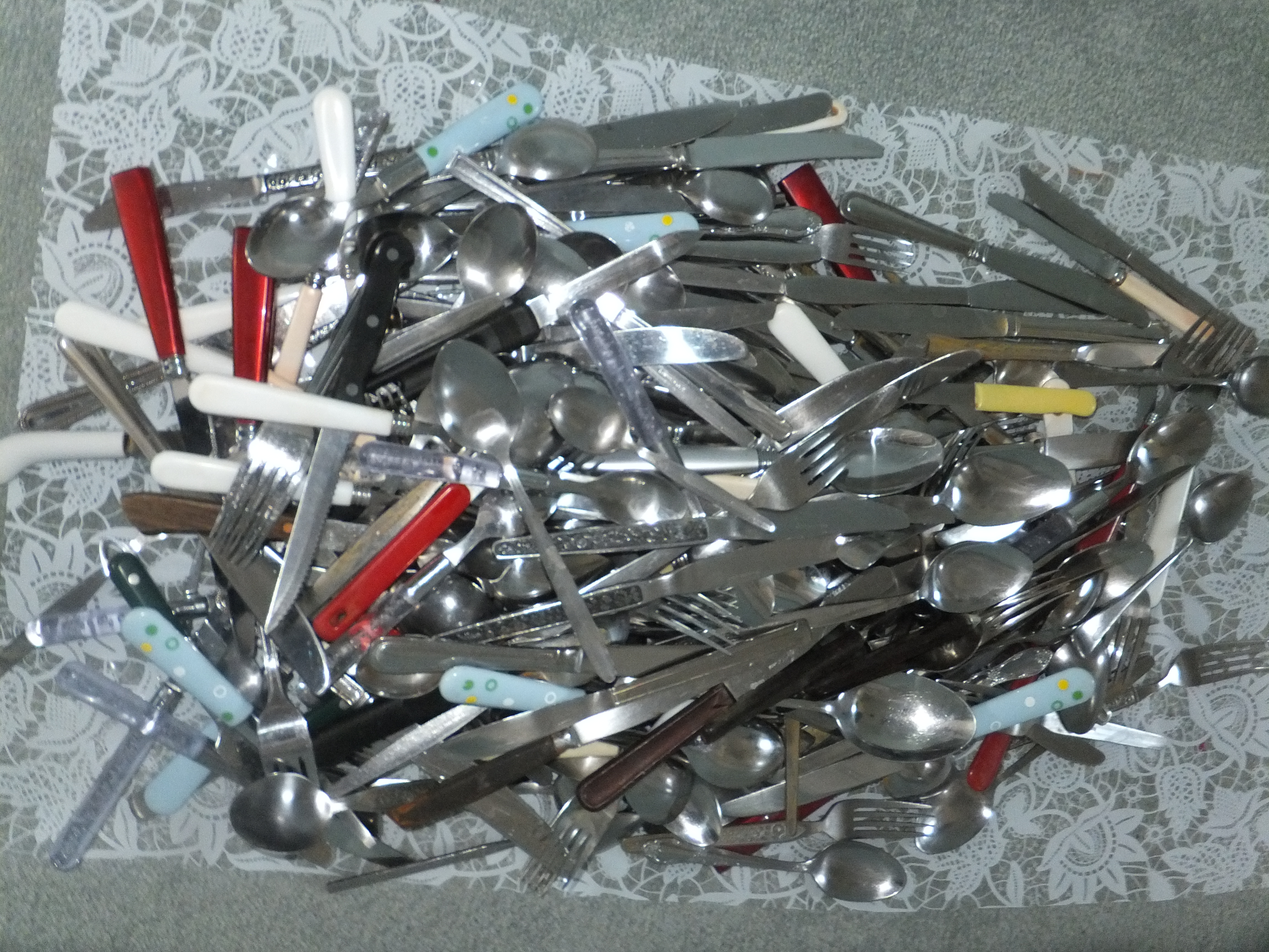 DSCF3583All this lovely cutlery ended up at the Borough of Poole tip.  But now, thanks to it being rescued by the Borough’s New2You project and some publicity from us, it will be finding a new home with the AOK Rucksack Appeal.  The AOK Rucksack Appeal work with homeless people in a variety of ways including providing rucksacks filled with essential items for those who are newly homeless.  http://www.aokrucksackappeal.org.uk/