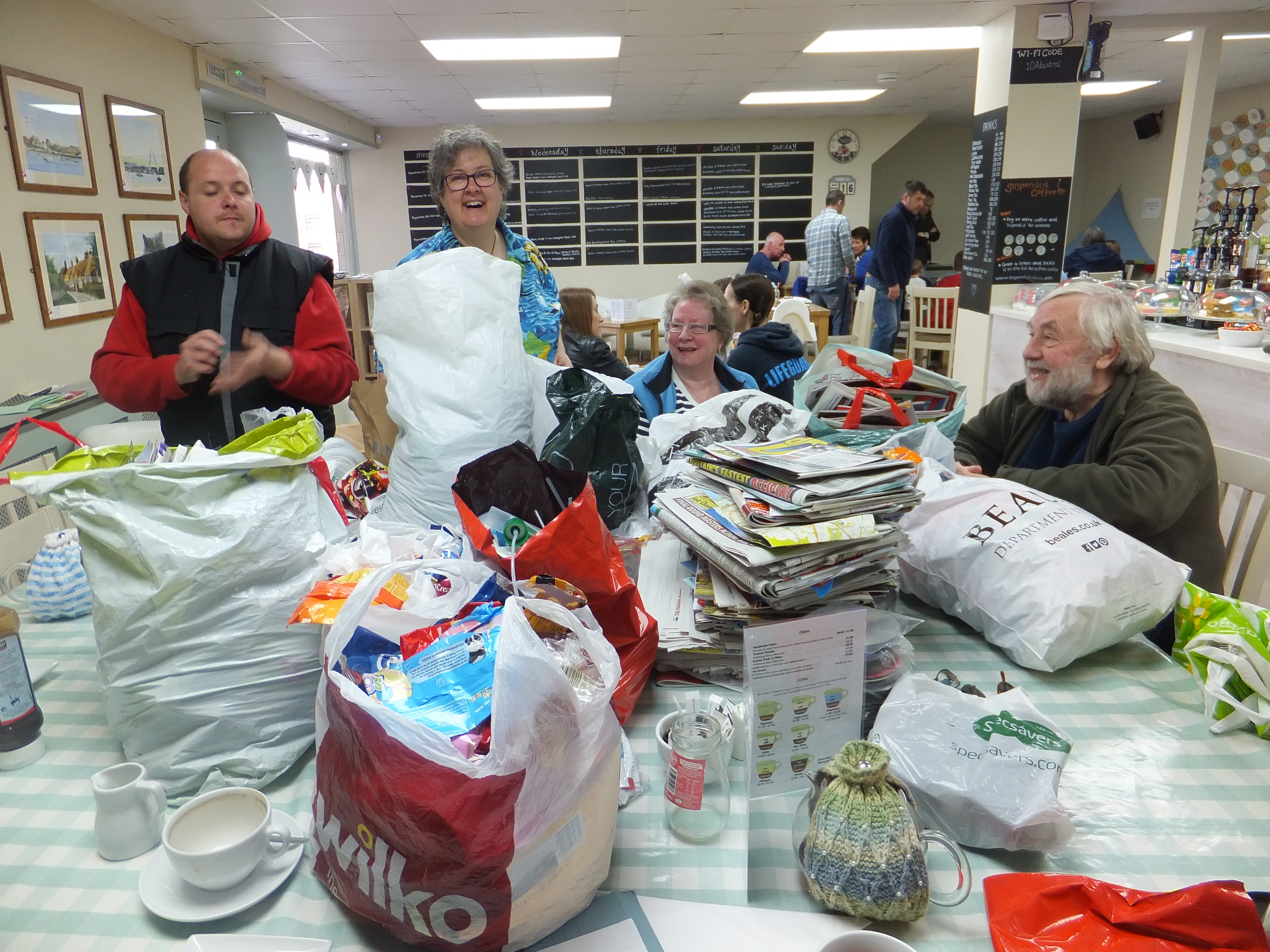 Twenty six people donated over 30 carrier bags and two cardboard boxes of items at the Canford Heath Win on Waste donation day at the Coffee House Cafe on Saturday 16 April. There were carrier bags of CD’s, milk bottle tops, biscuit wrappers, newspapers/junk mail/magazines, stamps, cleaning product items, cardboard tubes and jam jars. All the items will be put to good use or will be used to help raise money for the voluntary organisations who requested them.